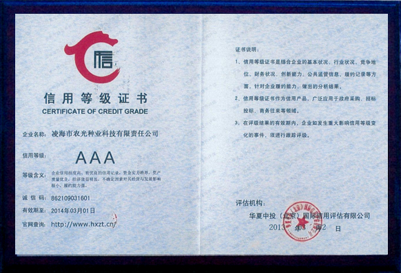 | 凌海市農(nóng)光種業(yè)科技有限責任公司是由遼寧省種子管理局和凌海市人民政府批準,集科研、生產(chǎn)、試驗示范、經(jīng)營為一體的種子企業(yè)。 公司擁有種子繁育基地3萬畝,年產(chǎn)種子1200萬公斤左右。自成立以來在農(nóng)業(yè)部及遼寧省歷次花期檢驗中,所生產(chǎn)的種子質(zhì)量合格,擁有良好的儲備、晾曬和機械加工設備,為了提高種子質(zhì)量,2015年新購置種子脫粒機、清選機、烘干機以及電腦包裝機等整套加工設備,擁有經(jīng)省技術監(jiān)督局認證的“標準化檢驗室”,投資20萬元購買人工氣候室、土壤測試儀、低溫低濕冷藏箱等各種檢驗設備。公司重視種子科研工作,現(xiàn)有科研育種實驗基地100畝,科研上以自主研發(fā)為主,同時與多家科研單位合作育種,每年繁、育、測交材料2000多份,現(xiàn)以推出五個組合參加錦州區(qū)域試種,其中“農(nóng)光3號、農(nóng)光4號”在錦州地區(qū)試驗中產(chǎn)量居首位。2006年公司買斷的連玉16玉米品種已通過5個省市的審認定,具有適應性廣、抗逆性強、產(chǎn)量高的特點,曾榮獲大連科技進步一等獎,深受廣大農(nóng)戶的歡迎。2008年公司新選育的農(nóng)光4000玉米品種在市種子管理站新品種大區(qū)試驗項目中。2012年公司買斷錦玉118品種權(quán),新品種的推廣與應用為公司的發(fā)展提供了充足的動力...... |